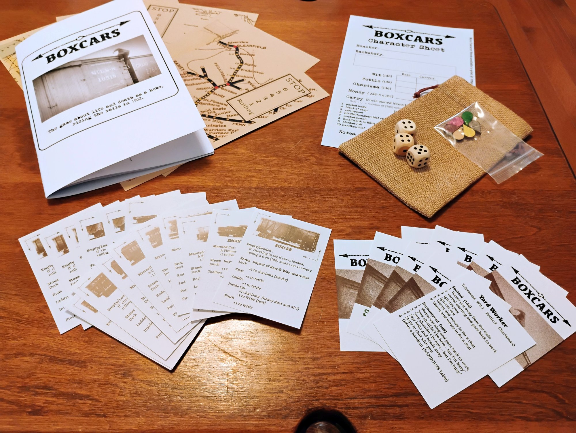 BOXCARS is a complete tabletop role-playing game in a single zine. It's played without a "game master" and allows for solo or small-groups to play out a complete story in a single session. Each player can take the role of a "hobo" or "tramps" traveling on the industrial arteries of a century ago, in search of a better life.